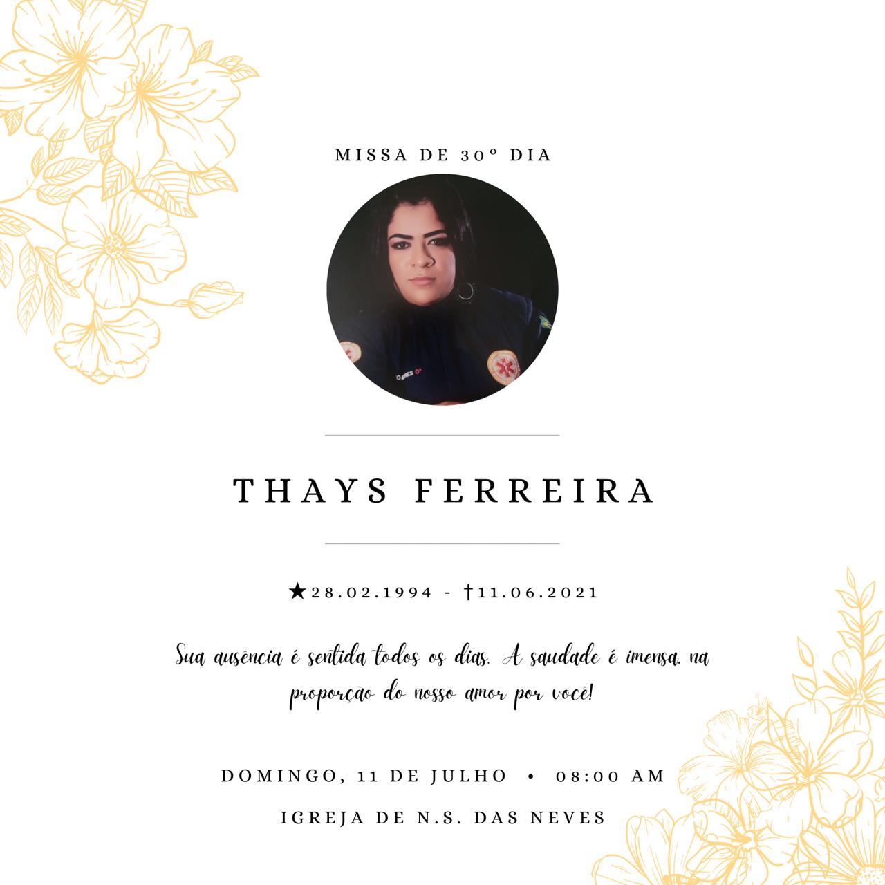 A família de Thays Ferreira Quirino comunica que a missa de 30 dias de seu falecimento será realizada às 8h deste domingo, 11/07, na Paróquia de Nossa Senhora das Neves, no bairro Bivar Olinto, em Patos.