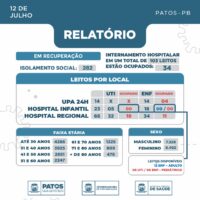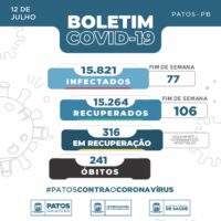 O Boletim Epidemiolo?gico de Patos divulgado nesta segunda-feira, 12 de julho, pela Vigila?ncia Epidemiolo?gica informa que 77 pessoas foram infectadas pela COVID-19 no último final de semana. Ale?m disso, 106 pessoas esta?o recuperadas nesse peri?odo, e 282 esta?o em isolamento domiciliar e 34 esta?o em internamento hospitalar.