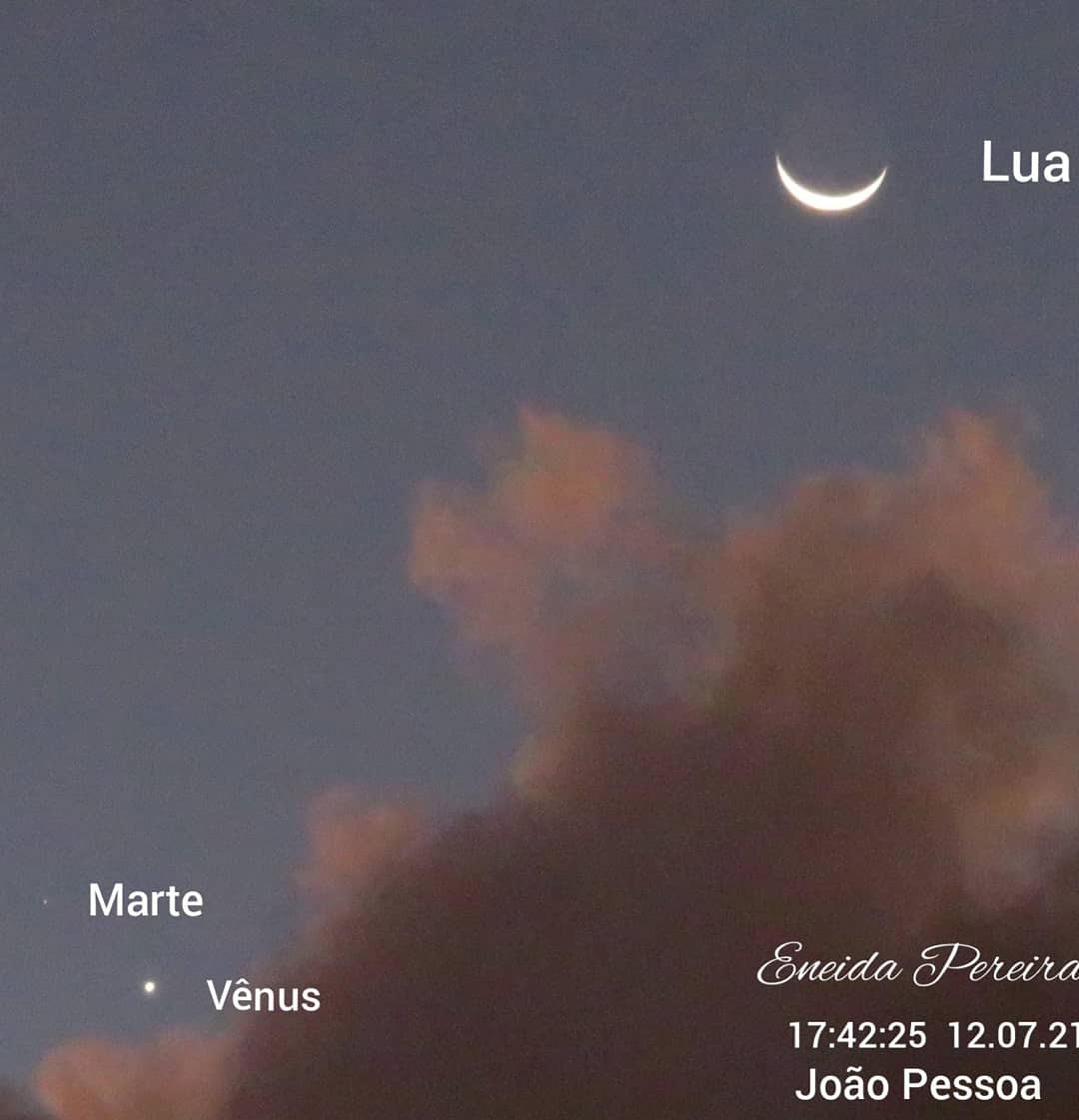 Quem prestou atenção no céu no início da noite desta segunda, 12 de julho, pôde contemplar um espetáculo: a conjunção entre Marte, Vênus e a Lua. E astrônomos amadores aqui da Paraíba, aproveitaram para registrar e compartilhar belas imagens desse momento.