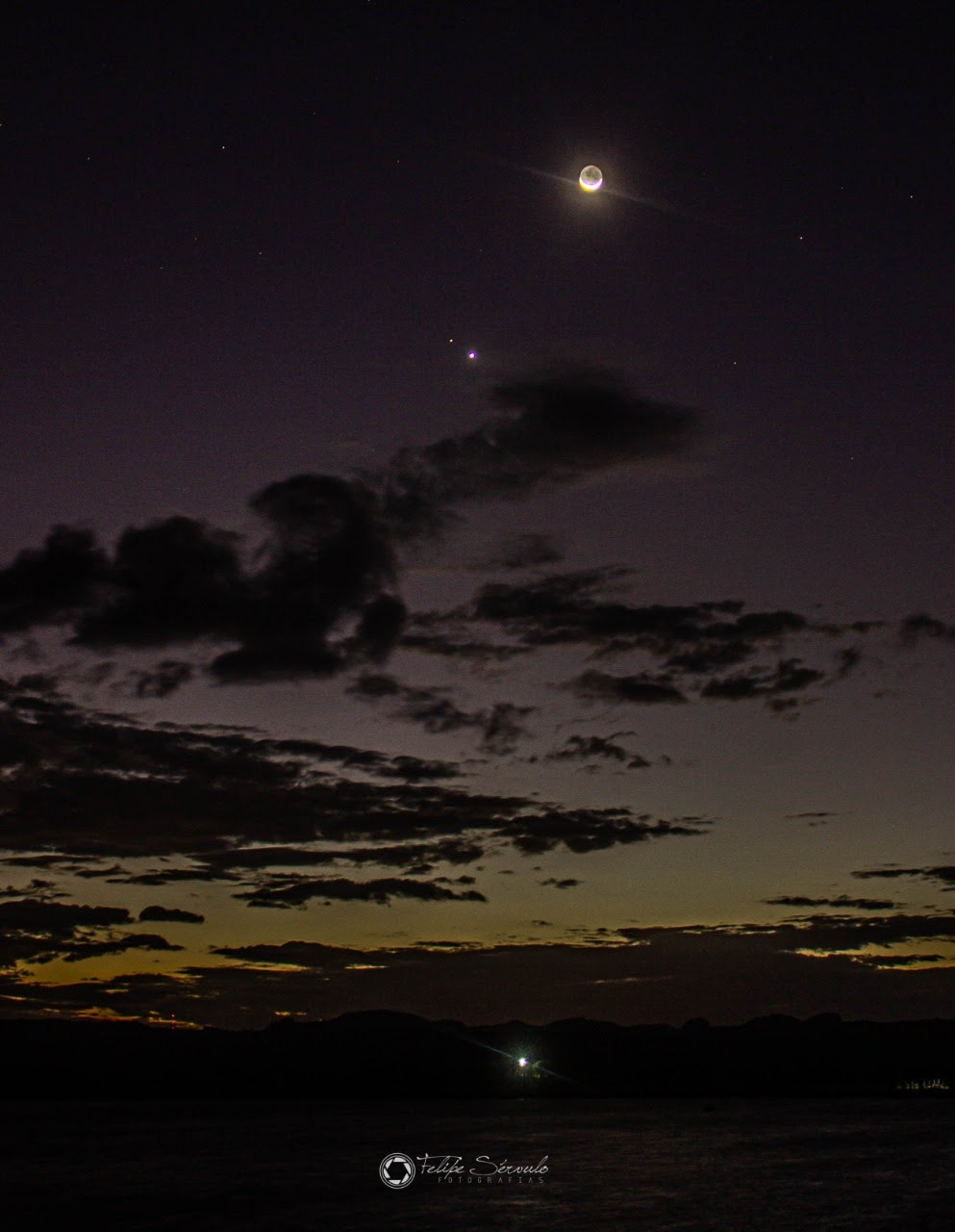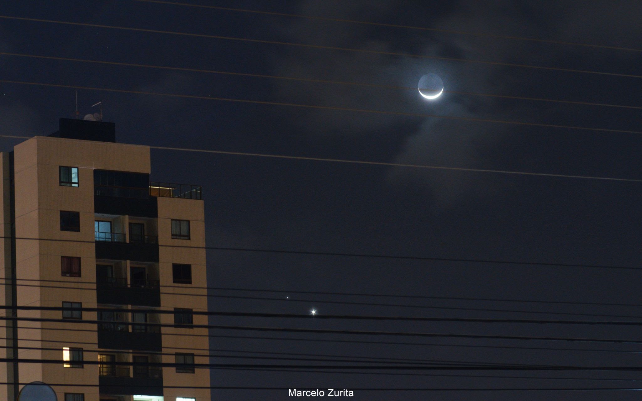 A Lua, à apenas 385 mil quilômetros da Terra, estava 8% iluminada, em fase crescente, e sua visão se destacava pela presença da chamada “luz cinérea”, que nada mais é do que a Luz do Sol refletida na Terra iluminando de forma tênue o lado escuro lunar. A luz cinérea também é chamada de “o brilho de da Vinci” porque foi Leonardo da Vinci (ele mesmo, o pintor da Monalisa) quem explicou o fenômeno há mais de 500 anos.