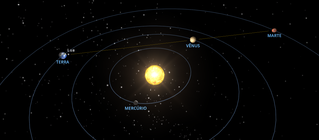 Já Marte estava a 372 milhões de quilômetros de distância. Além de estar mais distante, o Planeta Vermelho é bem menor e reflete menos luz que as nuvens de Vênus. Por isso, ele aparece bem menos brilhante à esquerda e um pouco acima de Vênus.