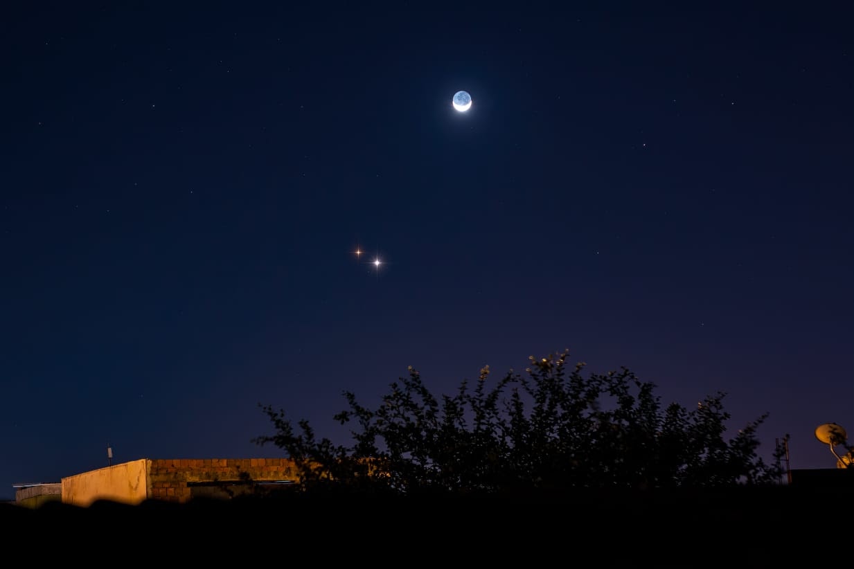 A Lua, à apenas 385 mil quilômetros da Terra, estava 8% iluminada, em fase crescente, e sua visão se destacava pela presença da chamada “luz cinérea”, que nada mais é do que a Luz do Sol refletida na Terra iluminando de forma tênue o lado escuro lunar. A luz cinérea também é chamada de “o brilho de da Vinci” porque foi Leonardo da Vinci (ele mesmo, o pintor da Monalisa) quem explicou o fenômeno há mais de 500 anos.