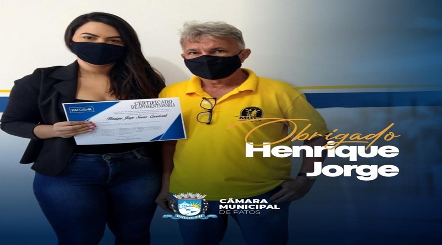 A Mesa Diretora da Câmara Municipal de Patos, através de sua presidente Tide Eduardo (PSL), reconheceu de público a contribuição dada pelo servidor Henrique Jorge Soares Cavalcante, que após 40 anos de serviços prestados ao Poder Legislativo Municipal, se aposentou. “O maior patrimônio desta casa é o quadro de servidores que ela tem. E um dos mais valorosos servidores que temos é o auxiliar de escrita Henrique Jorge, que infelizmente nos deixa. Ele dedicou toda uma vida às atividades desde Poder Legislativo.”, relatou a presidente em mensagem de agradecimento divulgada em suas redes sociais. “Durante quatro décadas, ele ajudou a escrever a história dos trabalhos desenvolvidos neste parlamento com muito profissionalismo, competência e, antes de tudo, com muita dedicação e amor ao ofício. ”, acrescentou a vereadora, lamentando a saída do servidor, no entanto, celebrando seu ápice na carreira de servidor público.