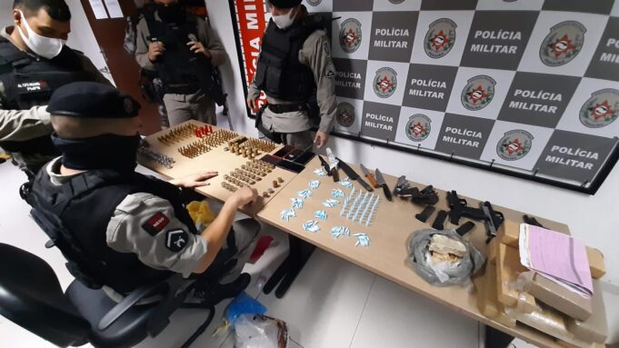 Os acusados estavam em uma casa com cinco armas de fogo, vários tabletes de substância semelhante à maconha, 170 pinos com cocaína, cerca de 250 munições, dinheiro, e vasto material usado também no cometimento de crimes como tocas, facas e roupas camufladas. Todo o material foi apreendido pelos policiais que estavam atuando na zona sul, como 5º Batalhão e Força Regional, e foi apresentado junto com os presos na Central de Flagrantes, no bairro do Ernesto Geisel (foto abaixo).