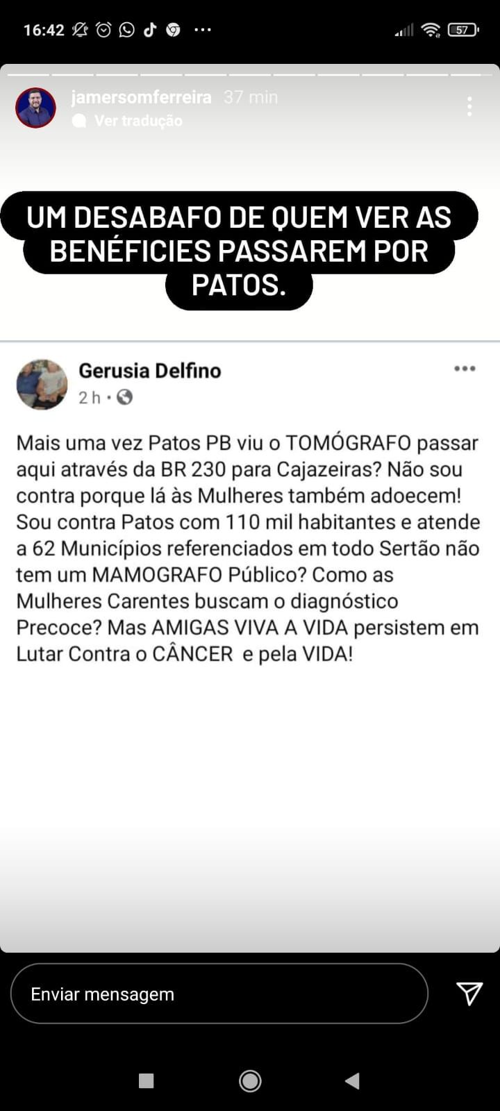 O vereador Jamerson Ferreira (PL) postou em suas redes sociais, o posicionamento da membro do movimento de mulheres Viva a Vida, que criticou a falta de um mamógrafo da cidade de Patos.