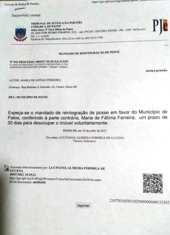 A ordem foi determinada pela 5ª Vara Mista de Patos, em processo que tramita desde 2.019, por conta de obras de mobilidade urbana na área. No local em que reside a família, a Prefeitura Municipal de Patos pede desocupação para que as obras tenham continuidade, pois foram paralisadas após o impasse de desobstrução do terreno público ora ocupado por Dona Céu e seus familiares.
