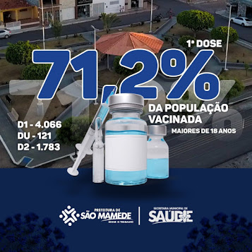 A cidade de São Mamede, na Região Metropolitana de Patos, ultrapassou nesta quinta feira marca dos 70% da população vacinada com a primeira dose contra a Covid-19. Ao todo, segundo os dados de Secretaria de Saúde do município, São Mamede aplicou 5.970 doses ao todo, ou seja 4.066 para primeira dose e 1.783 para segunda dose e 121 dose única.