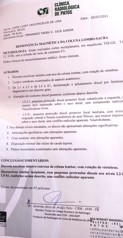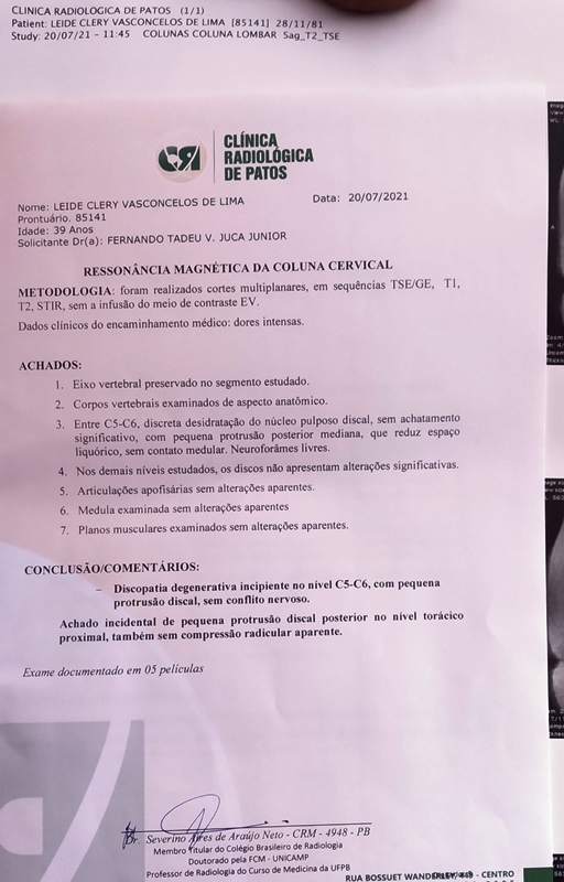 Valdo é casado com Leide Clery Vasconcelos de Lima, de 39 anos, que teve que parar de fazer as faxinas após começar a sentir fortes dores nas costas. O dinheiro das faxinas complementava a renda da família, mas há seis meses as dores ficaram tão insuportáveis que a dona de casa ficou quase que paralisada. O motivo dos desconfortos foram diagnosticados com uma ressonância magnética que apontaram hérnia de disco em seis vértebras.