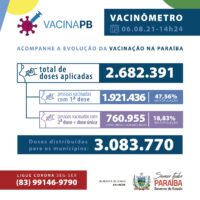 Foi registrado no sistema de informação SI-PNI a aplicação de 2.682.391 doses. Até o momento, 1.921.436 pessoas foram vacinadas com a primeira dose e 760.955 completaram os esquemas vacinais onde 700.525 tomaram as duas doses e 60.430 utilizaram imunizante de dose única. A Paraíba já distribuiu um total de 3.051.216 doses de vacina aos municípios.