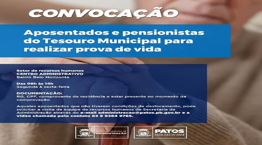A Prefeitura de Patos relembra aos aposentados e pensionistas do Tesouro Municipal para realização da prova de vida. O prazo para tal ação se encerra no próximo dia 25 de agosto.