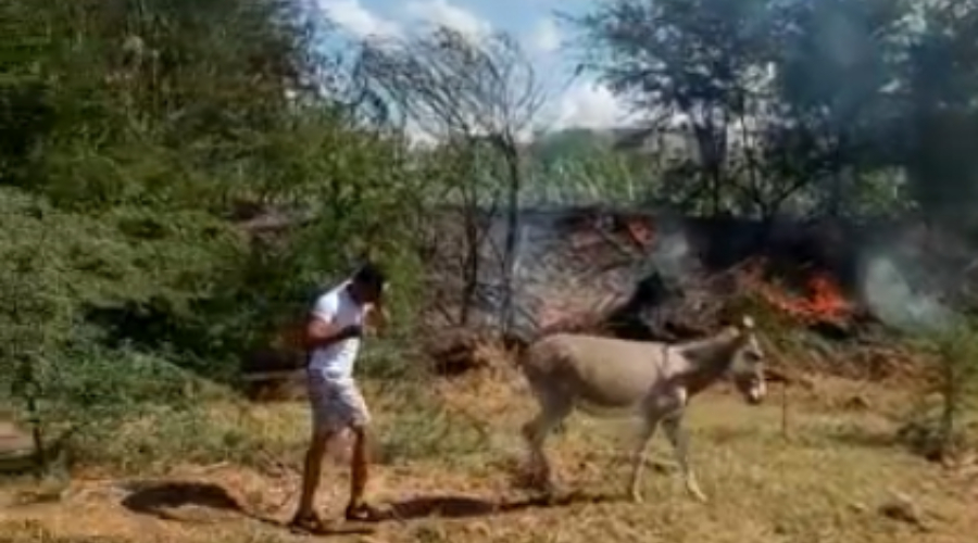 O jumento foi levado para um local seguro para evitar que fosse queimado pelo fogo. Os jovens informaram que não sabem a quem o animal pertence.