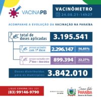 Foi registrado no sistema de informação SI-PNI a aplicação de 3.195.541 doses. Até o momento, 2.296.147 pessoas foram vacinadas com a primeira dose e 899.394 completaram os esquemas vacinais onde 837.159 tomaram as duas doses e 62.235 utilizaram imunizante de dose única. A Paraíba já distribuiu um total de 3.842.010 doses de vacina aos municípios.