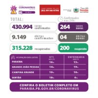 Até esta terça, 222 cidades paraibanas registraram óbitos por Covid-19. Os 04 óbitos confirmados neste boletim ocorreram entre residentes dos municípios de Bayeux (1); Junco do Seridó (1); Patos (1) e Sousa (1).