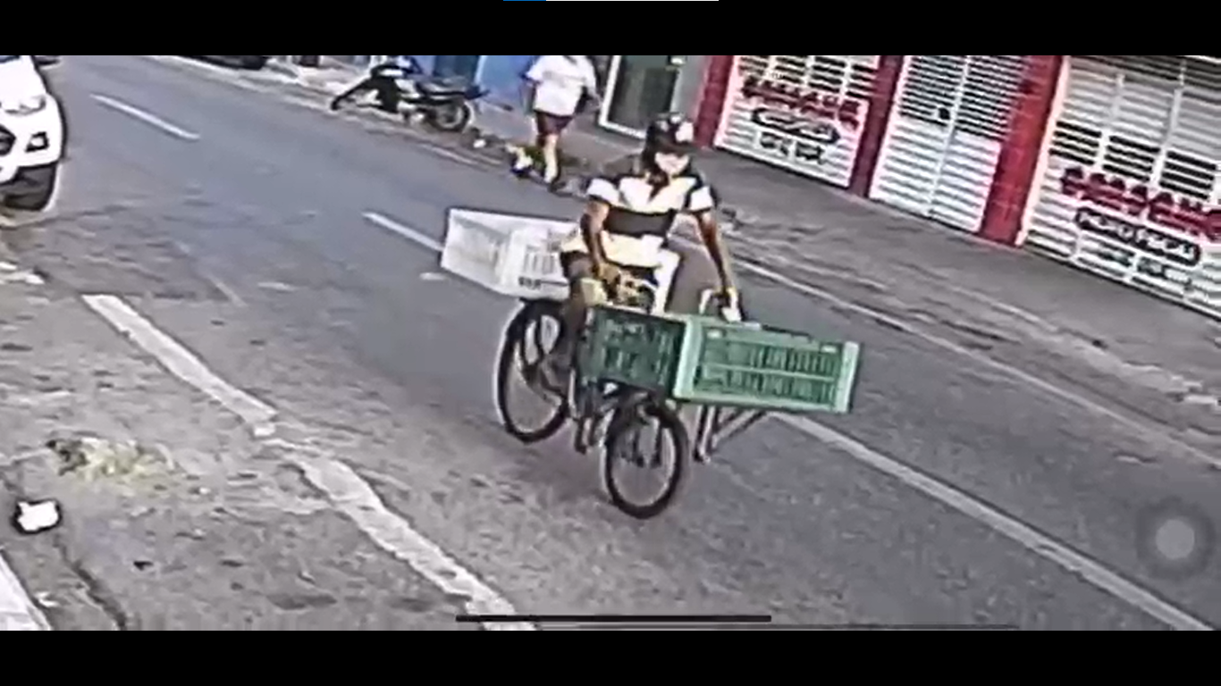Na gravação é possível perceber o infrator – rapaz trajando camisa listada, de bermuda, boné e máscara – deixando a padaria pedalando a bicicleta adaptada que faz a entrega dos produtos.