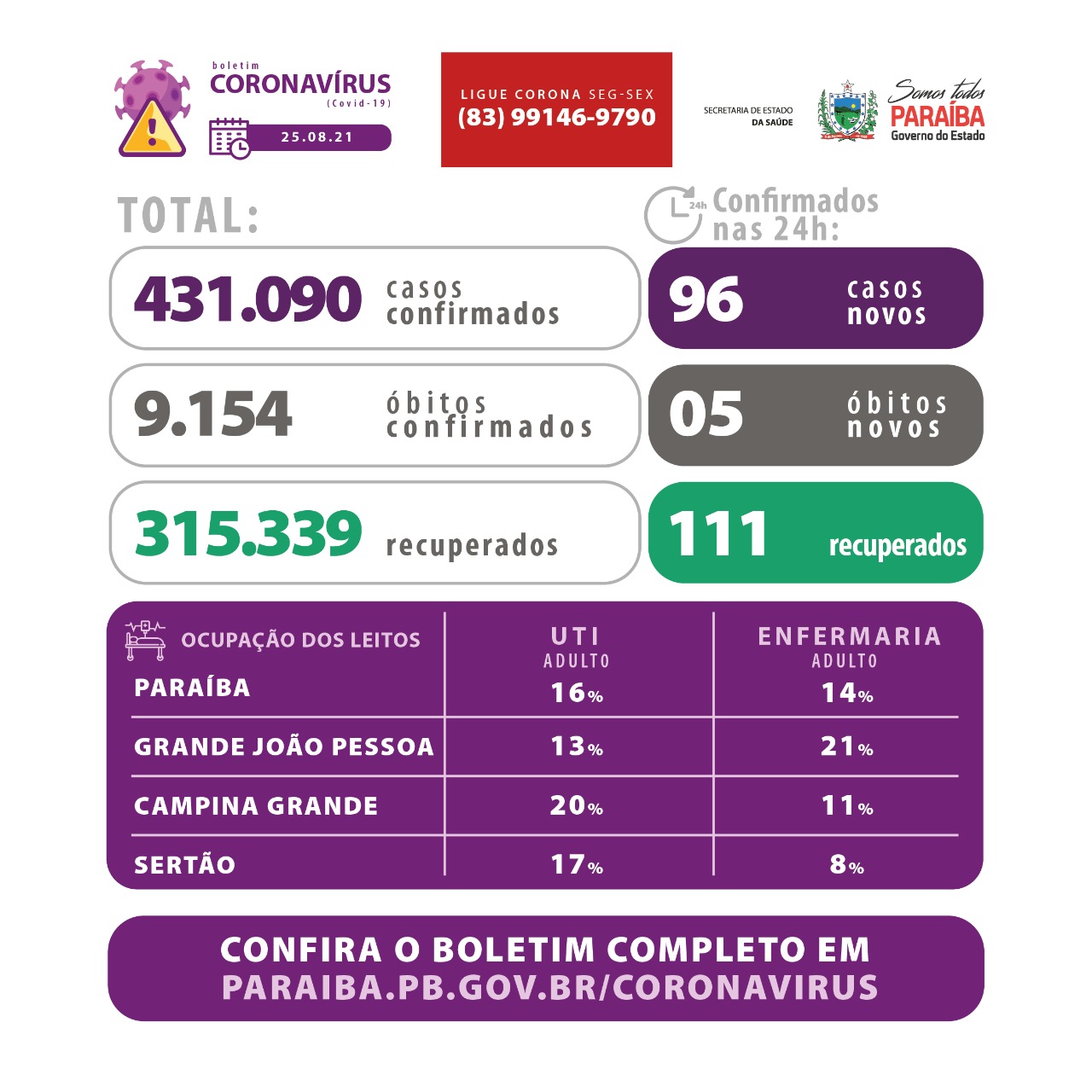 Os dados epidemiológicos com informações sobre todos os municípios e ocupação de leitos estão disponíveis em: www.paraiba.pb.gov.br/coronavirus.