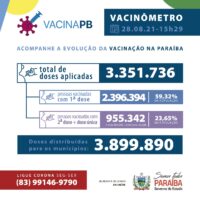 Foi registrado no sistema de informação SI-PNI a aplicação de 3.351.736 doses. Até o momento, 2.396.394 pessoas foram vacinadas com a primeira dose e 955.342 completaram os esquemas vacinais onde 893.004 tomaram as duas doses e 62.338 utilizaram imunizante de dose única. Assim, a Paraíba totaliza 2.458.732 indivíduos vacinados com a primeira dose ou imunizante de dose única, o que representa 61,17% da população do estado. A Paraíba já distribuiu um total de 3.899.890 doses de vacina aos municípios.