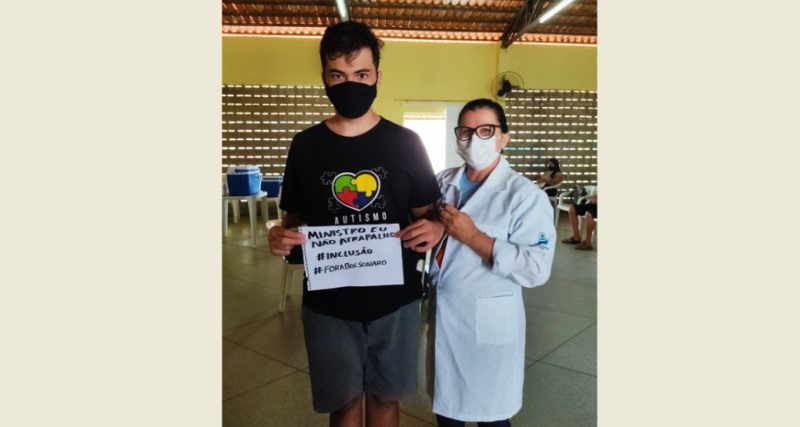 Durante a vacinação, o adolescente levou o seguinte recado por escrito: “Ministro eu não atrapalho! Inclusão! Fora Bolsonaro”. A revolta da família e das crianças especiais estão sendo feitas em todo o Brasil desde as declarações preconceituosas do Ministro da Educação Milton Ribeiro.