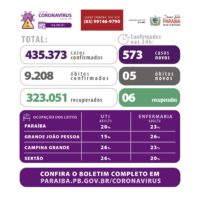 Até este sábado, 222 cidades paraibanas registraram óbitos por Covid-19. Os 05 óbitos confirmados neste boletim ocorreram entre residentes dos municípios de Alhandra (1), Araçagi (1), Cubati (1), João Pessoa (1) e Patos (1). As vítimas são 03 homem e 02 mulheres, com idades entre 1 e 56 anos. Diabetes, cardiopatia e hipertensão foram as comorbidades identificadas e dois não tinham comorbidades.