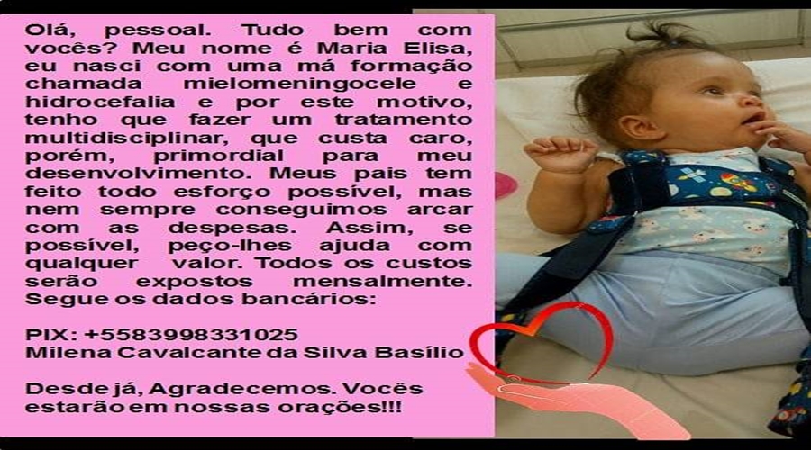 Milena Cavalcante da Silva Basílio, moradora do Distrito do Mimoso, na zona rural de Paulista, no Sertão da Paraíba, iniciou há alguns dias uma campanha beneficente em prol do tratamento de sua filha, a pequena Maria Elisa, de apenas oito meses de idade.