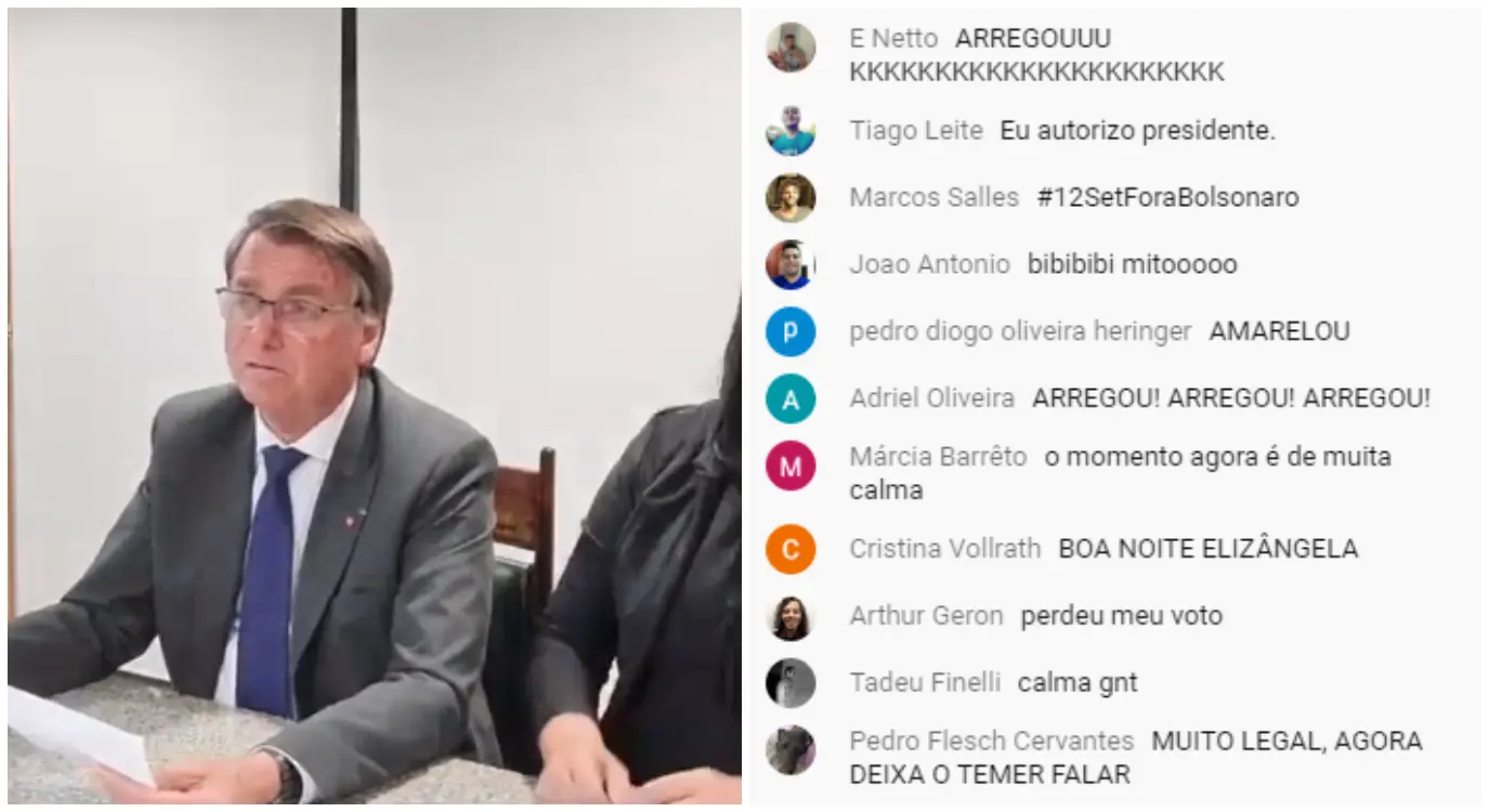 Os comentários que mais dominaram a transmissão foram “arregou”, “amarelou” e “perdeu meu voto”. Alguns apoiadores mais fiéis tentaram ponderar, pedindo para que os outros tenham “calma” e afirmando que confiam no presidente.