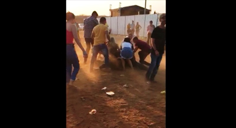 No vídeo é possível ver uma garota sendo puxada pelos cabelos por um rapaz, outros presentes na festa em desavença e pessoas dançando em meio a confusão.