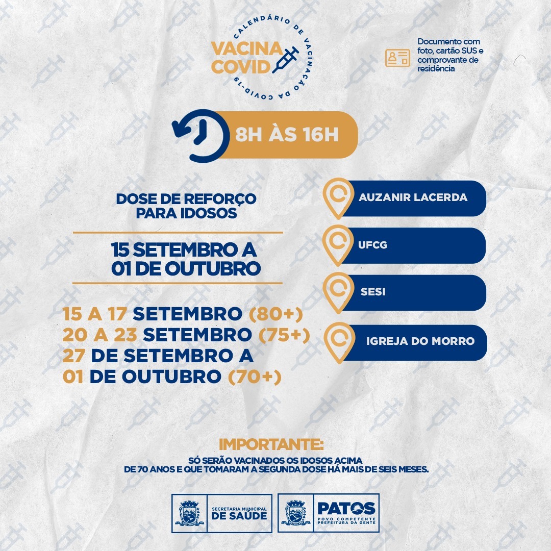 A partir da próxima quarta-feira, dia 15 de setembro, a Prefeitura de Patos e a Secretaria Municipal de Saúde darão início ao calendário de vacinação com dose de reforço para pessoas idosas a partir dos 70 anos de idade ou mais, que concluíram o esquema vacinal com a 2ª dose há seis meses, na Paraíba.