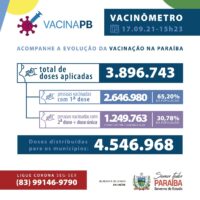 Foi registrado no sistema de informação SI-PNI a aplicação de 3.896.743 doses. Até o momento, 2.646.980 pessoas foram vacinadas com a primeira dose e 1.249.763 completaram os esquemas vacinais onde 1.187.104 tomaram as duas doses e 62.659 utilizaram imunizante de dose única. A Paraíba já distribuiu um total de 4.546.968 doses de vacina aos municípios.