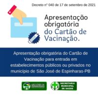 A Prefeitura de São José de Espinharas, na Região Metropolitana de Patos, estabeleceu através de decreto a obrigatoriedade da comprovação de vacinação contra a Covid-19 para o ingresso de pessoas em estabelecimentos do setor público ou privado.