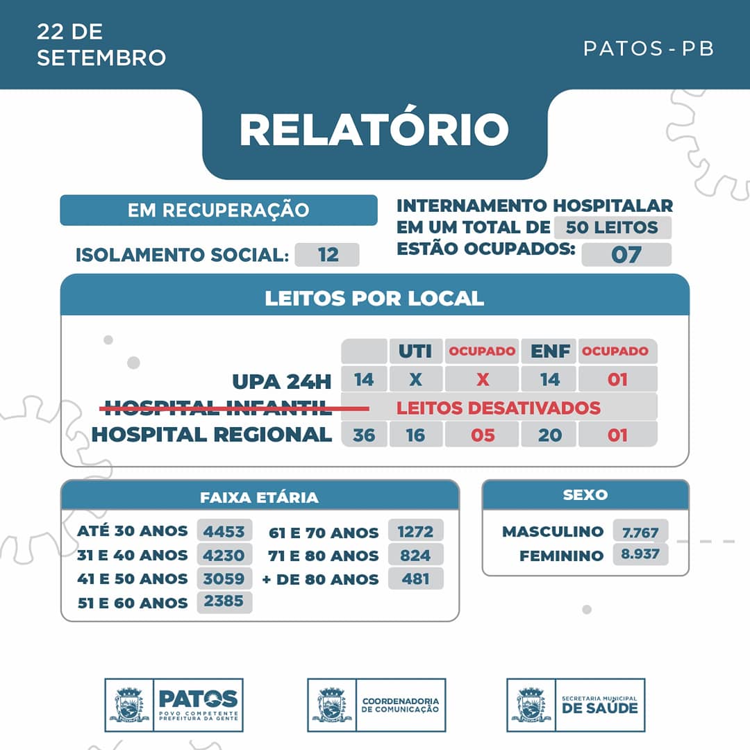 Desde o começo da pandemia, Patos registrou o total de 16.704 pessoas infectadas pelo vírus, 265 óbitos e 16. 420 recuperados.