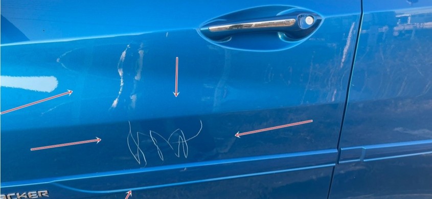 A médica que estava acompanhada do esposo, Lucas Xavier, relatou que ao se aproximar do carro, percebeu que na porta do lado passageiro existiam vários arranhões.