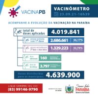 Foi registrado no sistema de informação SI-PNI a aplicação de 4.019.841 doses. Até o momento, 2.686.661 pessoas foram vacinadas com a primeira dose e 1.329.223 completaram os esquemas vacinais onde 1.266.508 tomaram as duas doses e 62.715 utilizaram imunizante de dose única. Sobre as doses adicionais, foram aplicadas 160 em pessoas com alto grau de imunossupressão e 3.797 doses de reforço na população com idade a partir de 70 anos. A Paraíba já distribuiu um total de 4.639.900 doses de vacina aos municípios.
