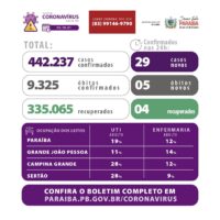 A Secretaria de Estado da Saúde (SES) registrou, nesta terça (5), 29 casos de Covid-19. Entre os confirmados hoje, 06 (20,69%) são moderados ou graves e 23 (79,31%) são leves. Agora, a Paraíba totaliza 442.237 casos confirmados da doença, que estão distribuídos por todos os 223 municípios. Até o momento, 1.188.174 testes para diagnóstico da Covid-19 já foram realizados.
