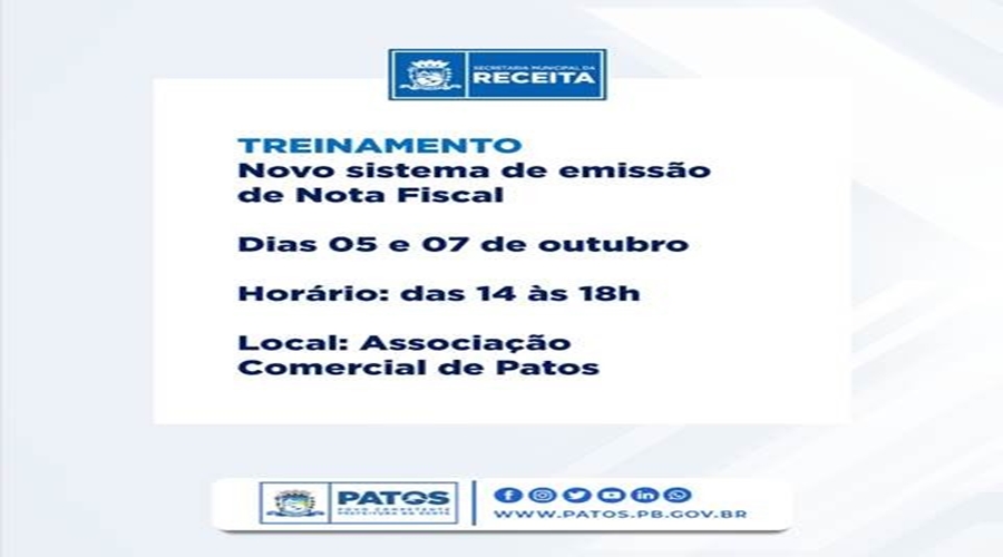 A Prefeitura de Patos, por meio da Secretaria da Receita e Diretoria de Administração Tributária (DAT), realiza nesta terça (05) e quinta-feira (07), treinamento da implantação do novo sistema gestor do ISSQN para emissão de nota fiscal eletrônica. A agenda de treinamento segue, tendo em vista o adiamento da implantação do novo sistema, que seria dia 1º de Outubro e ficou para ter início no dia 1º de Novembro.