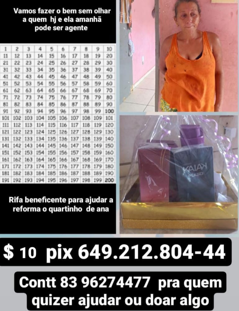 Para ajudar Ana Lúcia, está sendo vendida uma rifa de uma cesta com colônias, hidratante e outros itens, no valor de R$ 10,00 que pode ser paga pelo Pix 649.212.804-44. Já para quem quiser ajudar doando alguma coisa, entrar em contato pelo telefone (83) 996274477.