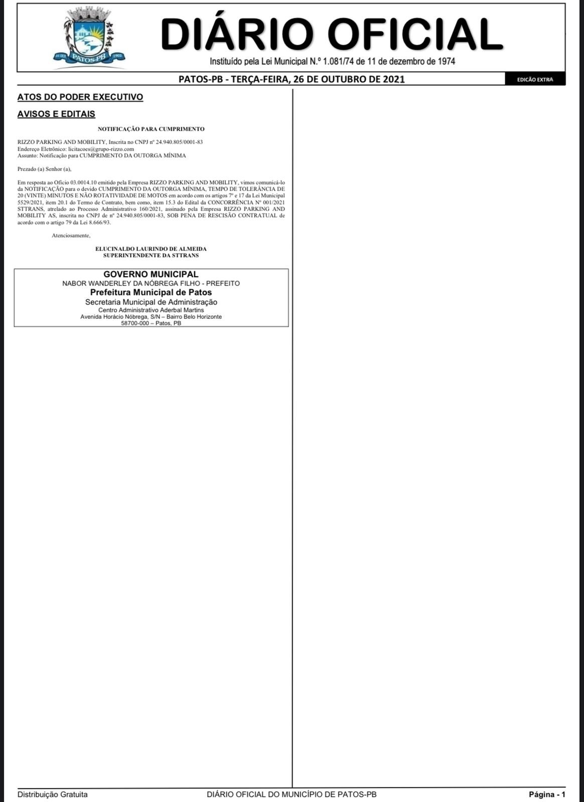 A Prefeitura de Patos, notificou no Diário Oficial dessa terça-feira, 26, em Edição Extra, a empresa RIZZO PARKING AND MOBILITY, para o devido cumprimento da outorga mínima, tempo de tolerância de 20 minutos e não rotatividade de motos em acordo com os artigos 7º e 17 da Lei Municipal 5.529/2021, sob pena de rescisão contratual.