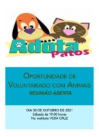 A ONG Adota Patos, entidade ligada à proteção a animais de rua em Patos e região metropolitana está convocando uma reunião para o próximo sábado, dia 30 de outubro, com o objetivo de recrutar novos voluntários que possam colaborar com o trabalho de cuidados com os animais.
