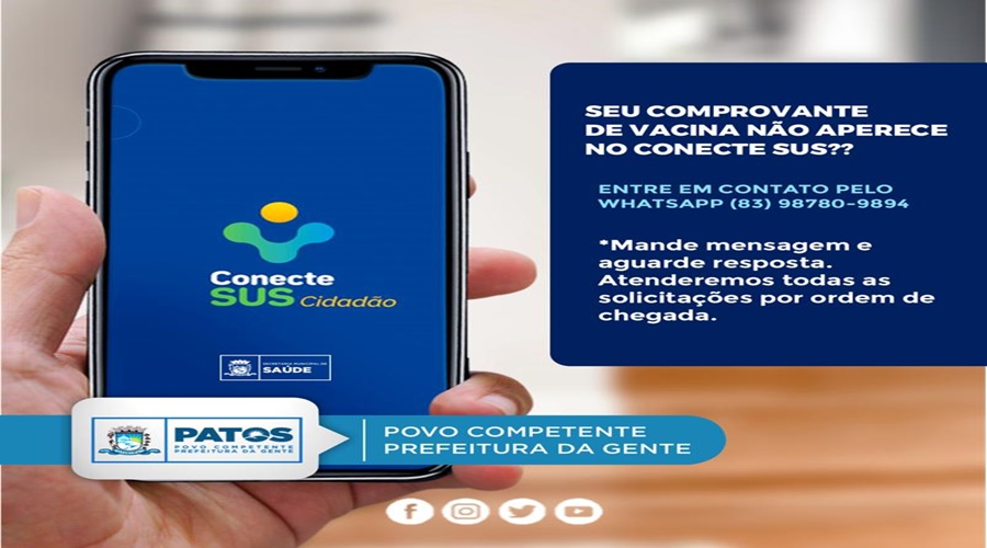Caso seu comprovante de vacina contra a Covid-19 ainda não esteja disponível na plataforma “Conecte SUS”, do Ministério da Saúde, entre em contato pelo número de WhatsApp: (83) 98780-9894, e busque atualizar suas informações.