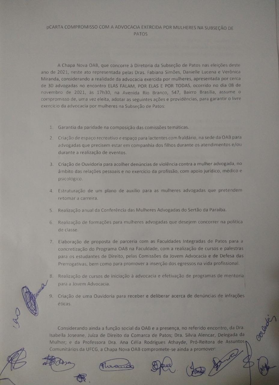 Após as discussões, as advogadas integrantes da Chapa Nova OAB firmaram uma carta compromisso elencando propostas para promover a equidade de gênero no exercício da advocacia, e apontando ações para contribuir no combate à violência contra a mulher.
