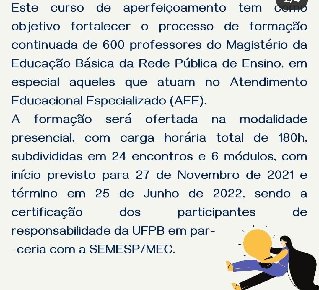 O curso é promovido pela UFPB e Patos terá um polo. O local das aulas será na EMEF Aristides Hamad Timene, realizadas aos sábados, tendo início agora em novembro e encerra em junho de 2022.