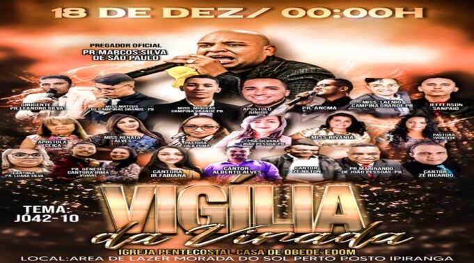 A Igreja Pentecostal Casa de Obede-Edom, dirigida pelos pastores Leandro Silva e Luana Silva, realizará a Vigília da Virada, que vai acontecer a partir da meia-noite do dia 18 de dezembro, na Área de Lazer Morada do Sol, próximo ao Posto Ipiranga, em Patos.