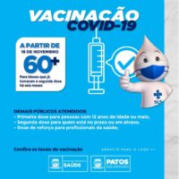 A partir desta quinta-feira (18), a Prefeitura de Patos passa a aplicar a dose de reforço da vacina anticovid em pessoas idosas com 60 anos ou mais.