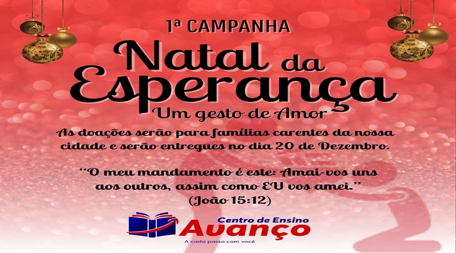 Com o objetivo de doar 150 cestas básicas para famílias que estão em situação de vulnerabilidade socioeconômica, o Centro de Ensino Avanço lança na manhã dessa sexta-feira, 19 de novembro, a Campanha Natal da Esperança Avanço.