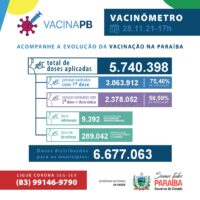 Foi registrado no sistema de informação SI-PNI, a aplicação de 5.740.398 doses. Até o momento, 3.063.912 pessoas foram vacinadas com a primeira dose e 2.378.052 completaram os esquemas vacinais, o que representa 79,02% da população com idade a partir de 18 anos. Do total de vacinados com o esquema primário completo, 2.313.885 tomaram as duas doses e 64.167 utilizaram imunizante de dose única. Sobre as doses adicionais, foram aplicadas 9.392 em pessoas com alto grau de imunossupressão e 289.042 doses de reforço na população com idade a partir de 60 anos. Estão com esquemas vacinais atrasados na Paraíba,com base nos aprazamentos preconizados pelo Ministério da Saúde, 491.973 indivíduos. Esse número se refere às pessoas que receberam a primeira dose e não receberam a segunda, ou que receberam ambas as doses do esquema primário e ainda não receberam o reforço. A Paraíba já distribuiu um total de 6.677.063 doses de vacina aos municípios.