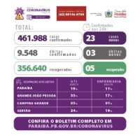 Até esta terça, 222 cidades paraibanas registraram óbitos por Covid-19. Os óbitos confirmados neste boletim aconteceram entre os residentes dos municípios de Cabedelo (2) e João Pessoa (1). As vítimas são dois homens e uma mulher, com idades entre 38 e 64 anos. Uma das vítimas não possuía comorbidade.