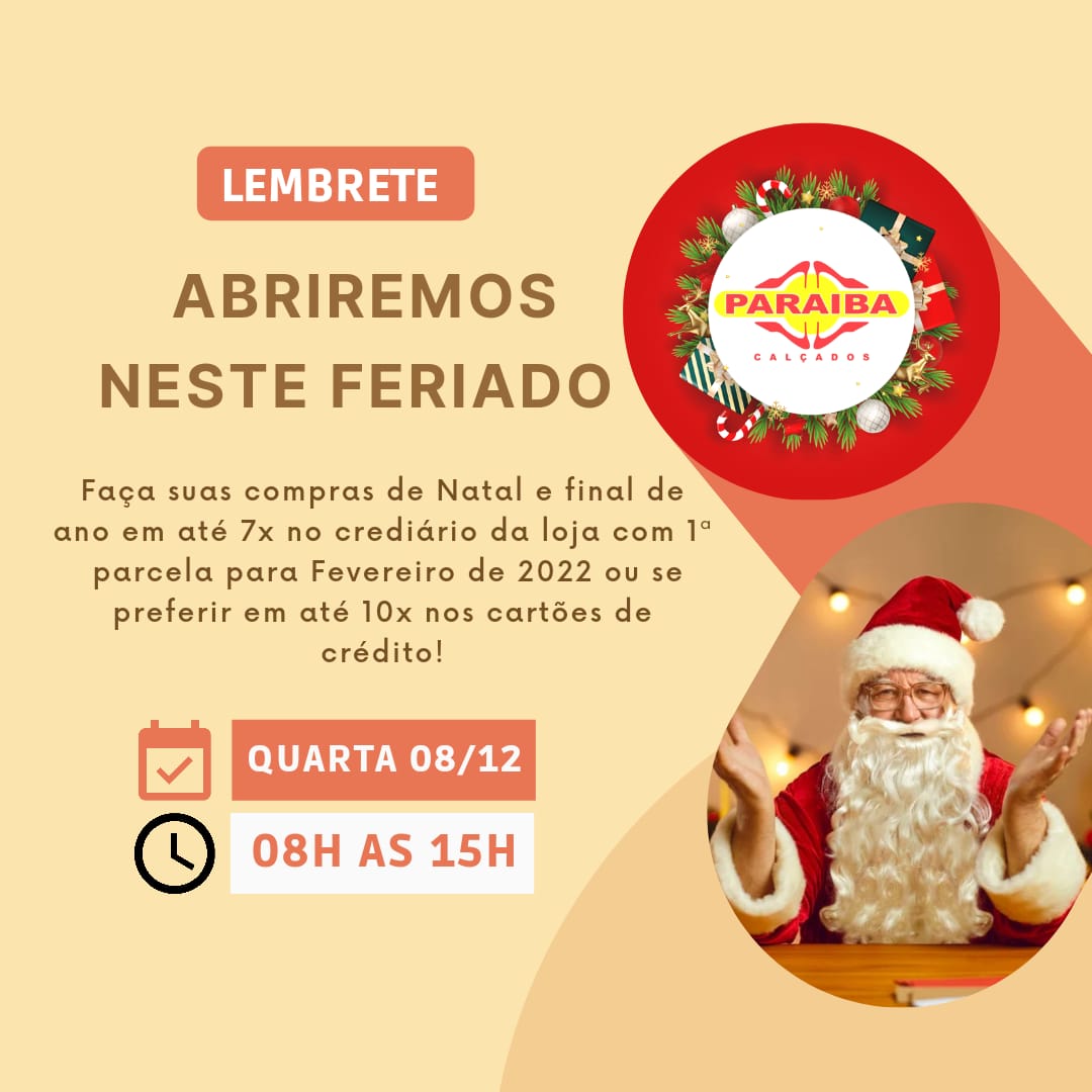 A Paraíba Calçados, na Rua Pedro Firmino, no centro de Patos, continua com excelentes promoções para o Natal e fim de ano em calçados, malas e outros itens. Abriremos todos os domingos durante o mês de dezembro, das 8h às 14h. Venha nos visitar!