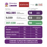 A Secretaria de Estado da Saúde (SES) registrou, neste sábado (11), 18 casos de Covid-19, todos moderados ou graves. Devido à instabilidade no sistema E-Sus, o boletim de hoje foi elaborado somente com dados do Sivep Gripe. Agora, a Paraíba totaliza 462.585 casos confirmados da doença, que estão distribuídos por todos os 223 municípios. Até o momento, 1.239.911 testes para diagnóstico da Covid-19 já foram realizados.