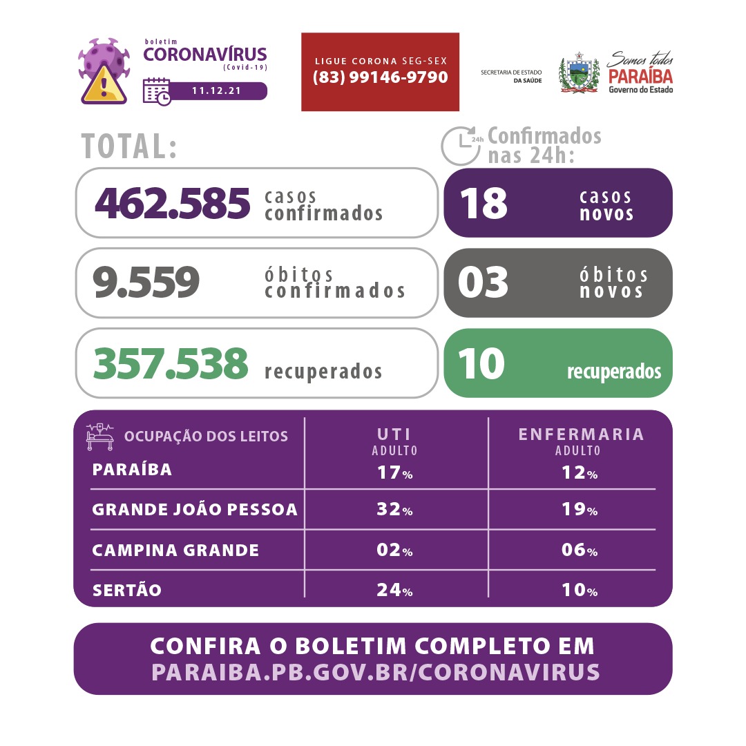 Os dados epidemiológicos com informações sobre todos os municípios e ocupação de leitos estão disponíveis em: www.paraiba.pb.gov.br/coronavirus.