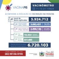 Foi registrado no sistema de informação SI-PNI, a aplicação de 5.924.712 doses. Até o momento, 3.092.431 pessoas foram vacinadas com a primeira dose e 2.490.146 completaram os esquemas vacinais, o que representa 81,85% da população com idade a partir de 18 anos. Do total de vacinados com o esquema primário completo, 2.425.852 tomaram as duas doses e 64.294 utilizaram imunizante de dose única. Sobre as doses adicionais, foram aplicadas 10.450 em pessoas com alto grau de imunossupressão e 331.685 doses de reforço na população. Estão com esquemas vacinais atrasados na Paraíba, com base nos aprazamentos preconizados pelo Ministério da Saúde, 458.097 indivíduos. Esse número se refere às pessoas que receberam a primeira dose e não receberam a segunda, ou que receberam ambas as doses do esquema primário e ainda não receberam o reforço. A Paraíba já distribuiu um total de 6.720.103 doses de vacina aos municípios.