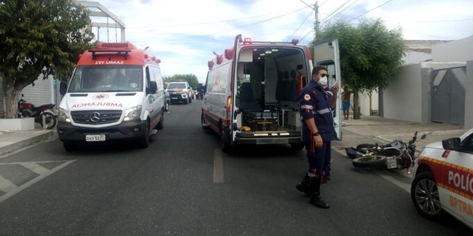 O acidente simultâneo registrado na tarde deste sábado, dia 11, por volta das 14h00, na Rua Elias Asfora, no Jardim Guanabara, em Patos, causou danos a uma ambulância do Serviço de Atendimento Móvel de Urgência (SAMU) e feriu um motociclista.