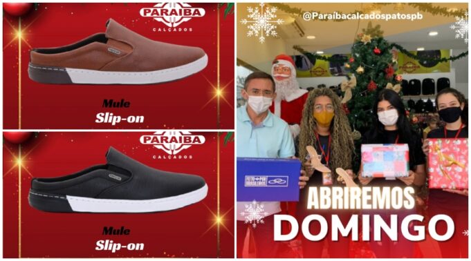 A Paraíba Calçados, na Rua Pedro Firmino, no centro de Patos, segue com suas promoções de Natal e ano novo, abrindo suas portas também aos domingos, das 8h às 14h, neste mês de dezembro. Venha conferir as excelentes promoções para o Natal e fim de ano em calçados, malas e outros itens.